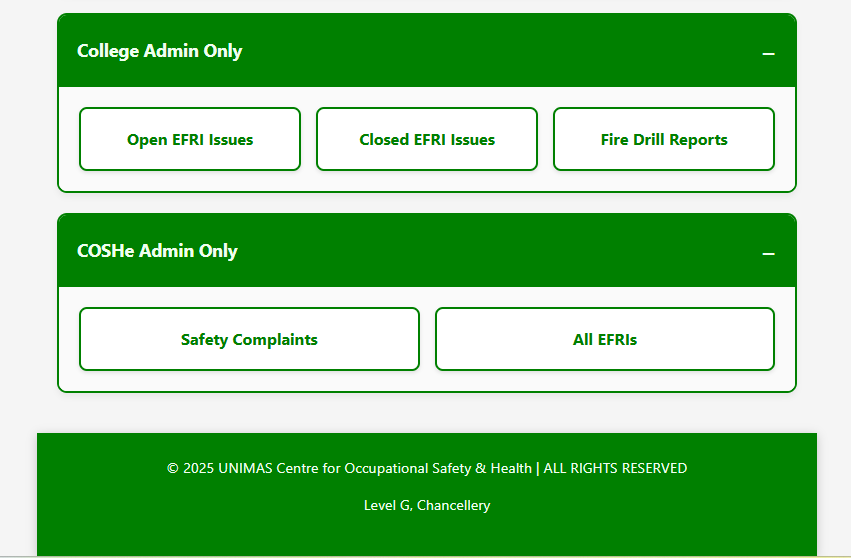 Centralized Data Management: Provides COSHe (Centre for Occupational Safety and Health) with a holistic view of all safety complaints and inspection data across all residential colleges.